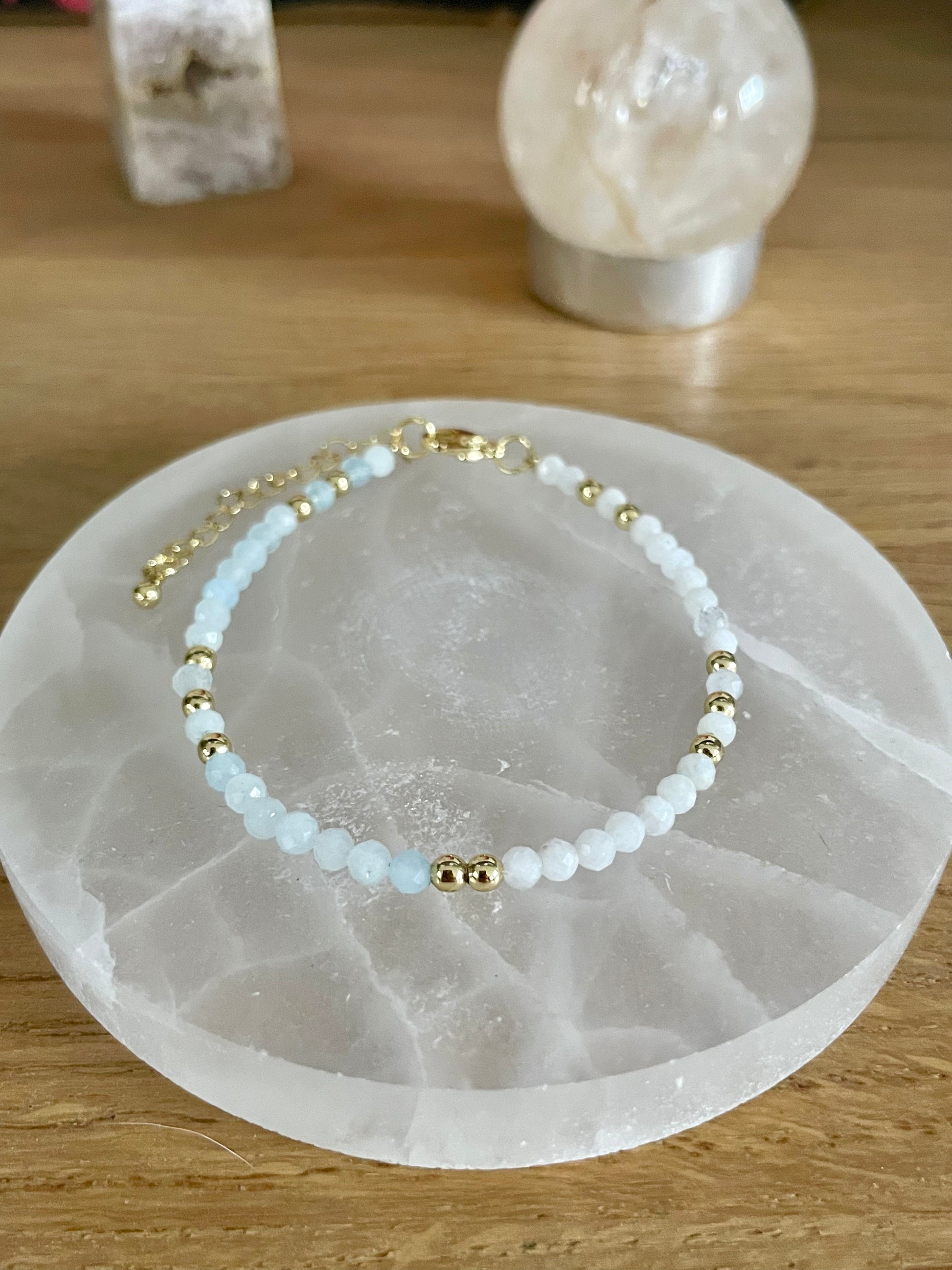 Aquamarine brings in the calming and tranquil energy of the ocean to aid balancing emotions and reveling inner strength while Moonstone brings connection to the empowerment of the divine feminine supporting in new beginnings and inner feminine power.