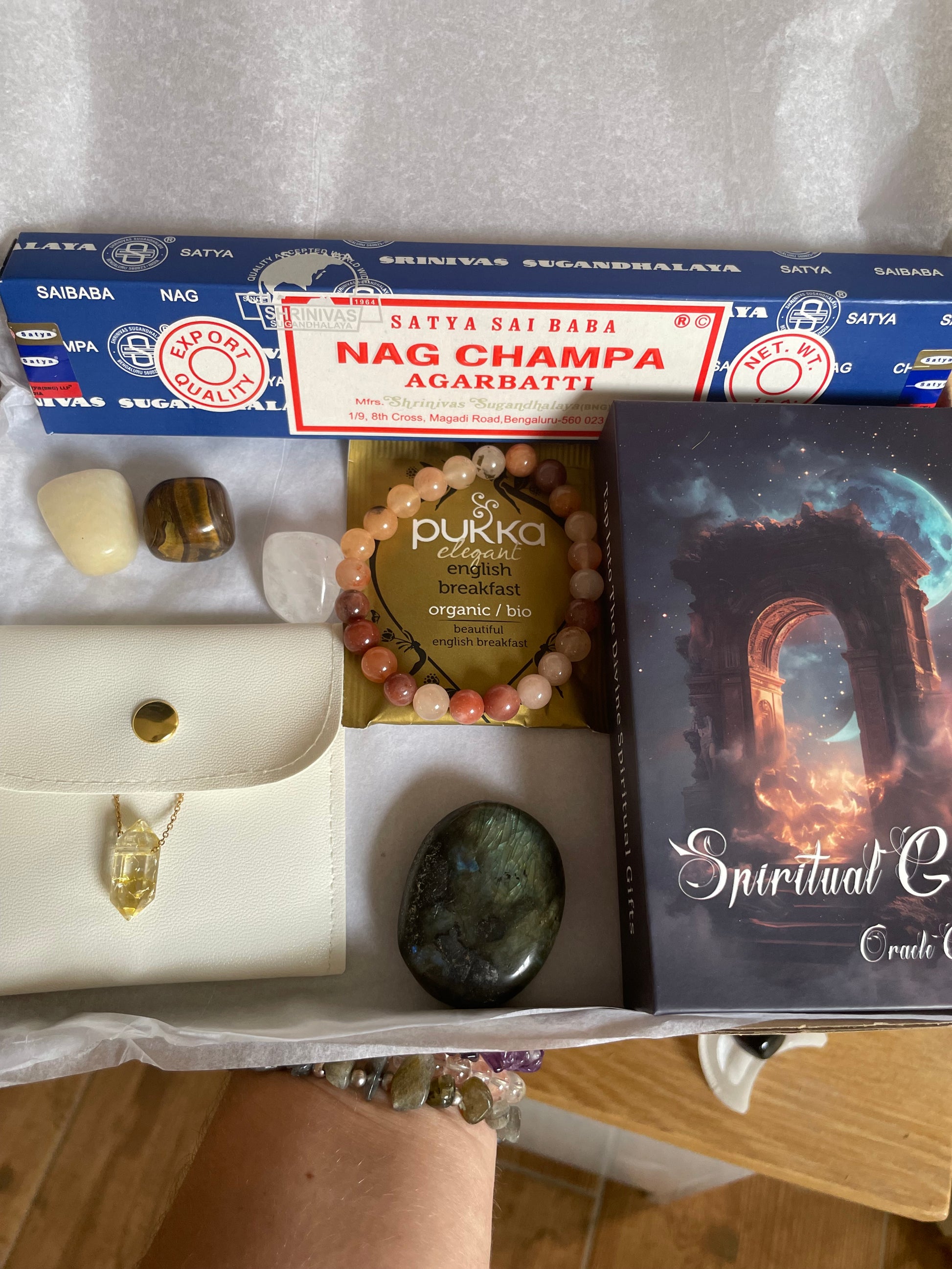 Ignite your dreams with the Manifestation Crystal Box, a powerful collection crafted to help you attract abundance and positivity. Inside, you'll find stunning carnelian and citrine crystal jewelry, each piece designed to enhance motivation and prosperity. Dive into self-reflection with oracle cards that inspire clarity and intention-setting. Elevate your manifesting rituals with fragrant incense, creating an ambiance for focus and energy. Complementing the collection are a selection of tumble stones, each handpicked to boost manifestation practices. This box is the perfect companion for anyone ready to harness the power of intention and create a life they love.